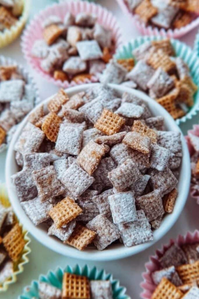 Use a large bowl when mixing to avoid breaking the cereal. And always let the mixture cool slightly before shaking it with sugar—this helps avoid clumps. If you’re feeling bold, visit this brownie batter puppy chow for a chocolate overload that will leave guests raving.