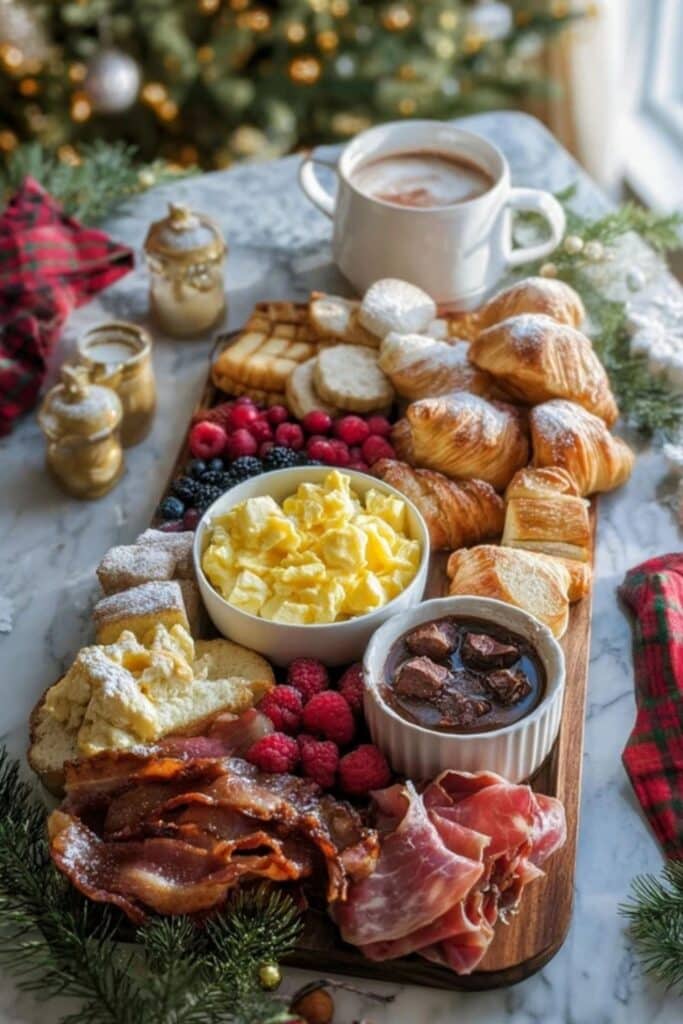 Include seasonal additions like peppermint bark, cranberry jam, and holiday sprinkles on yogurt parfaits. Use ramekins or small jars to contain spreads or dips. The Festive Christmas Breakfast Charcuterie Board should feel lush and layered. It’s not just food—it’s a Christmas story told in textures.