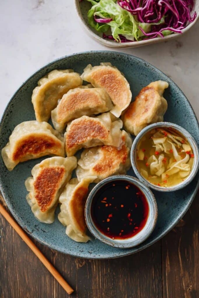 Instead of filling the mixture mostly with pork, these dumplings pack in plenty of shredded cabbage plus a moderate amount of lean ground chicken, turkey, or crumbled tofu. You still get that rich dumpling flavor from garlic, ginger, soy sauce, and sesame oil, but the cabbage lightens everything up and adds a subtle sweetness. The result: pan-fried cabbage dumplings that feel indulgent, but sit lighter than meat-heavy versions.