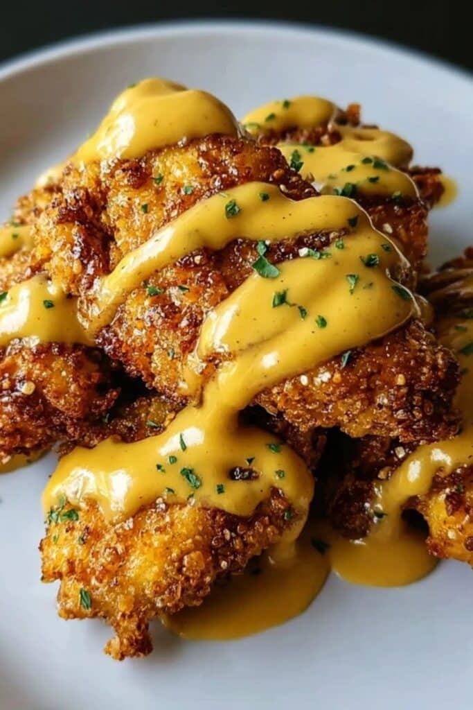Visuals matter. Slice the chicken diagonally to show off the juicy interior and golden crust. Drizzle the mustard-cheddar sauce lightly over the chicken, letting it cascade down the sides. Add a small dish of extra sauce for dipping. It turns into an interactive, hands-on meal that feels almost like Cheesy Taco Sticksโfun, inviting, and flavor-packed.